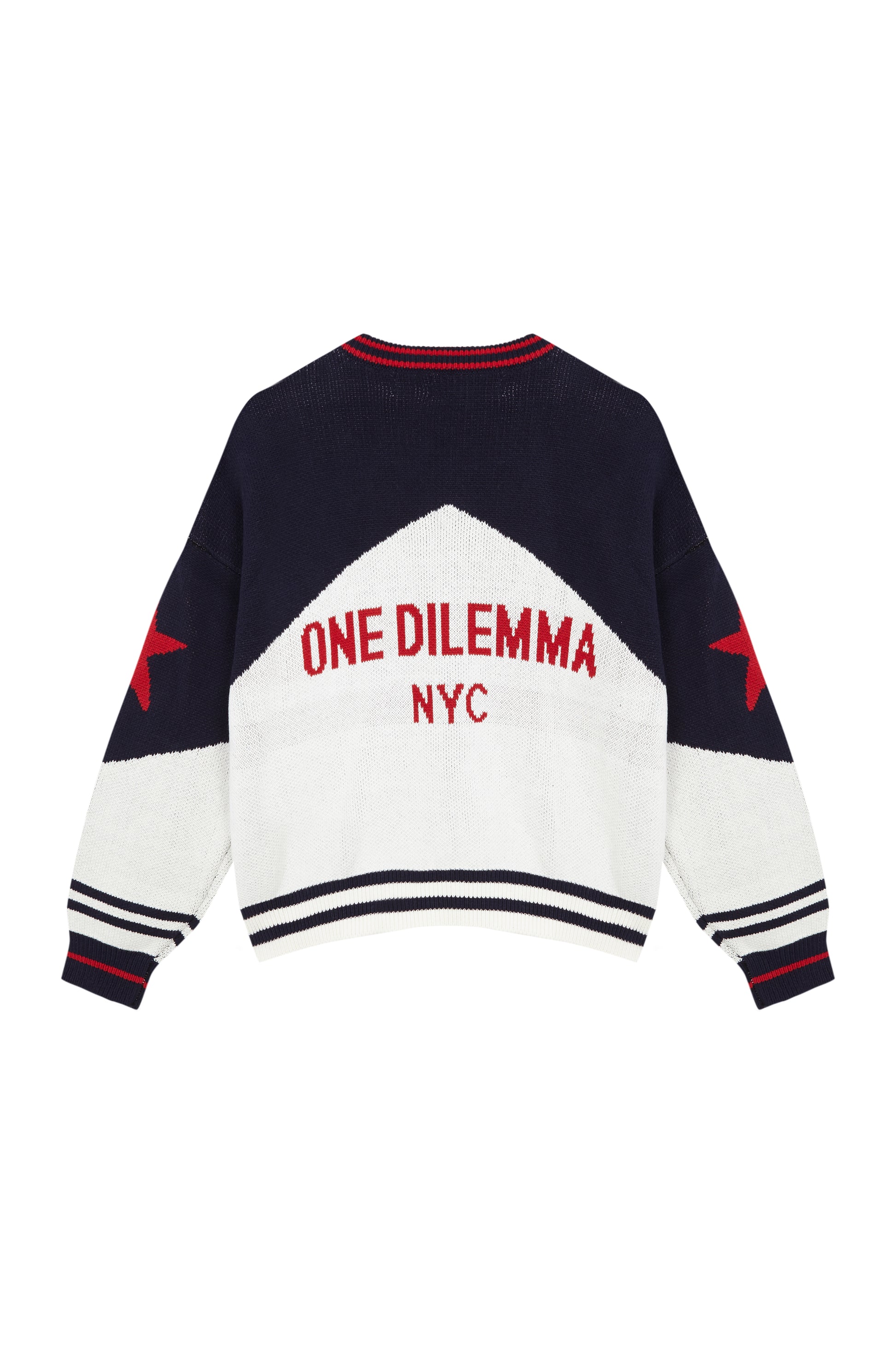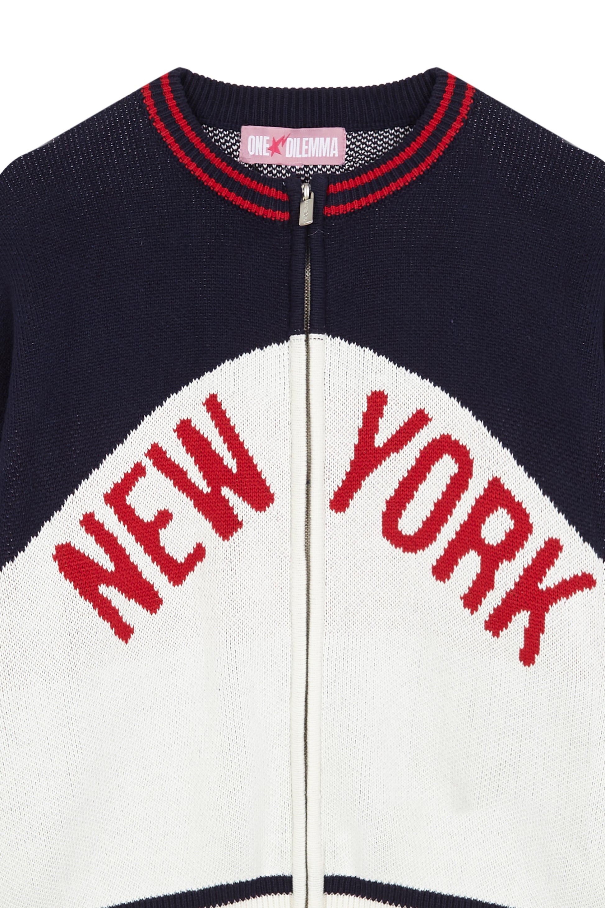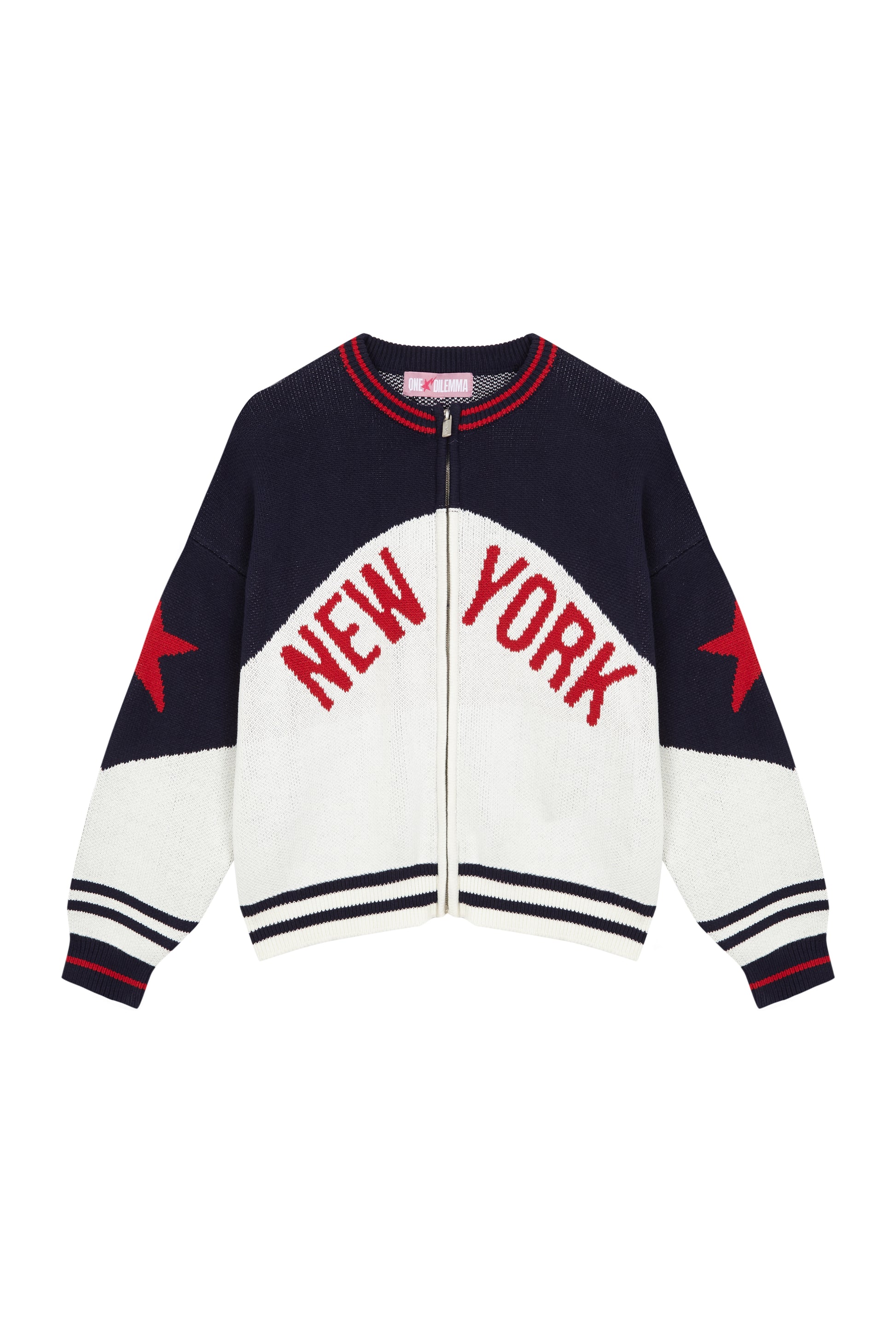 En la parte trasera, destaca el logo ONE DILEMMA en rojo y en la parte delantera new york en rojo, con lineas en la parte baja y mangas. Con un cierre frontal con cremallera metálica con el logo de one dilemma grabado.