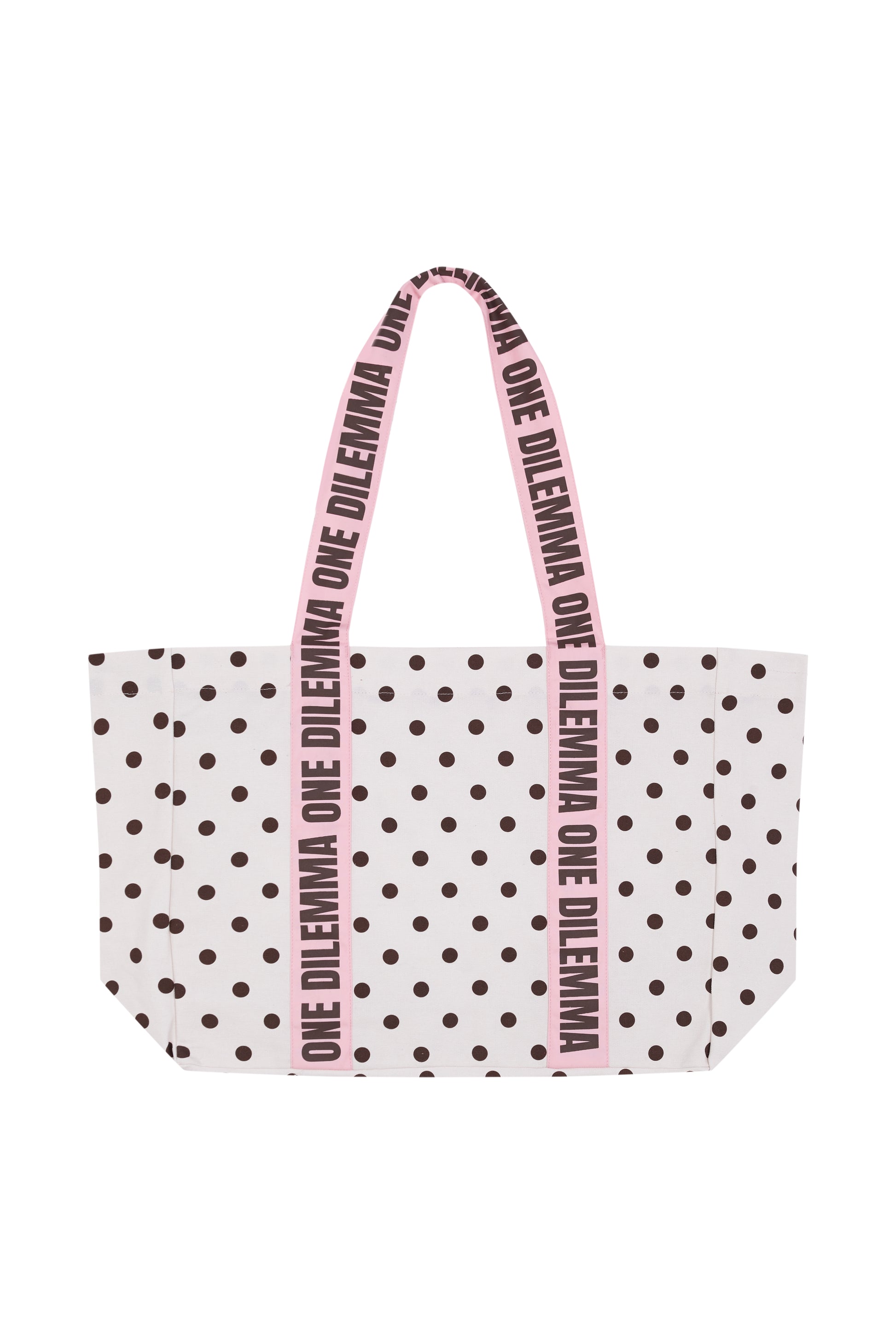 Tote-bag de tela, 100% algodón, con estampado de lunares y asas rosas con logo a lo largo.