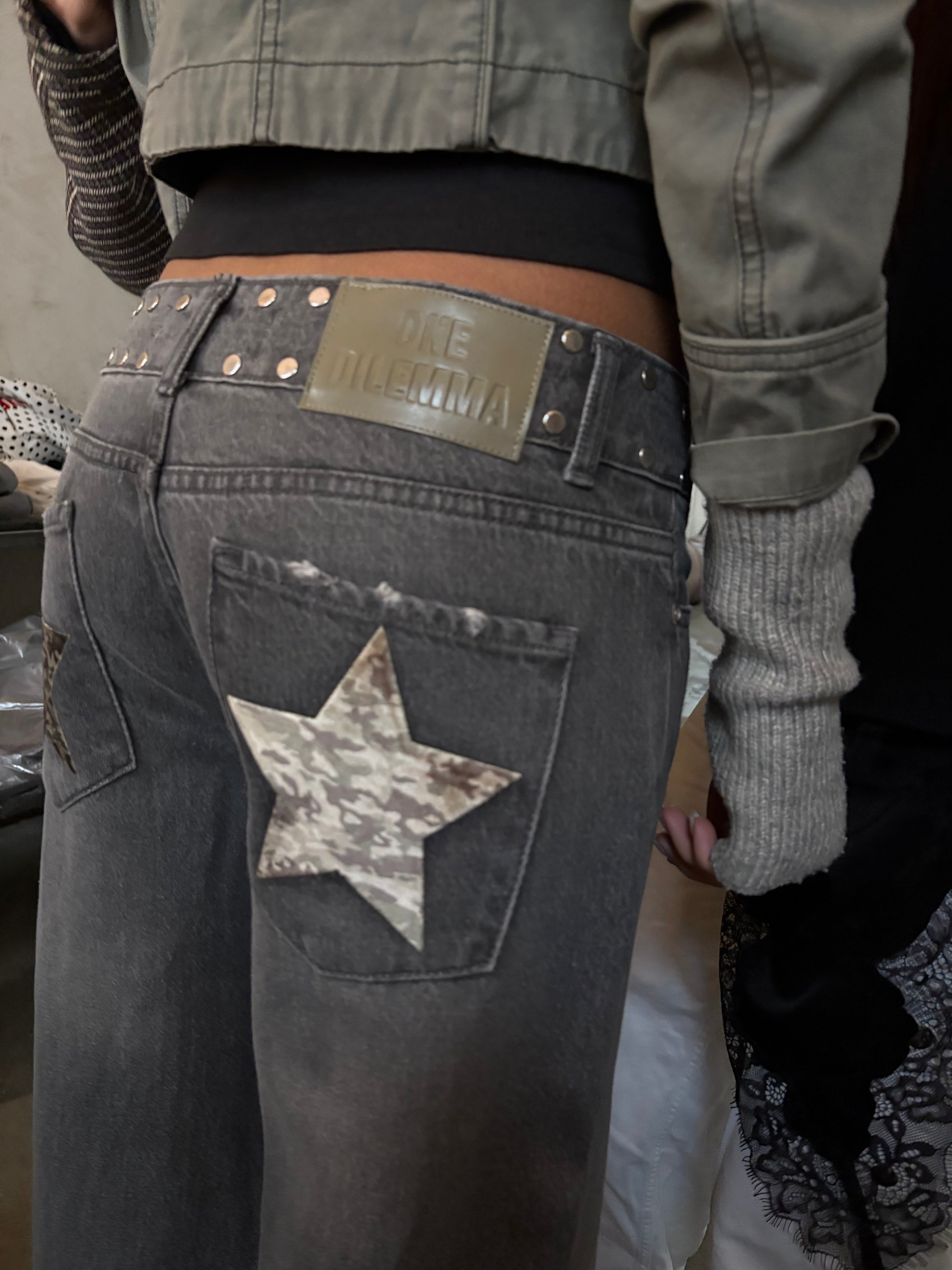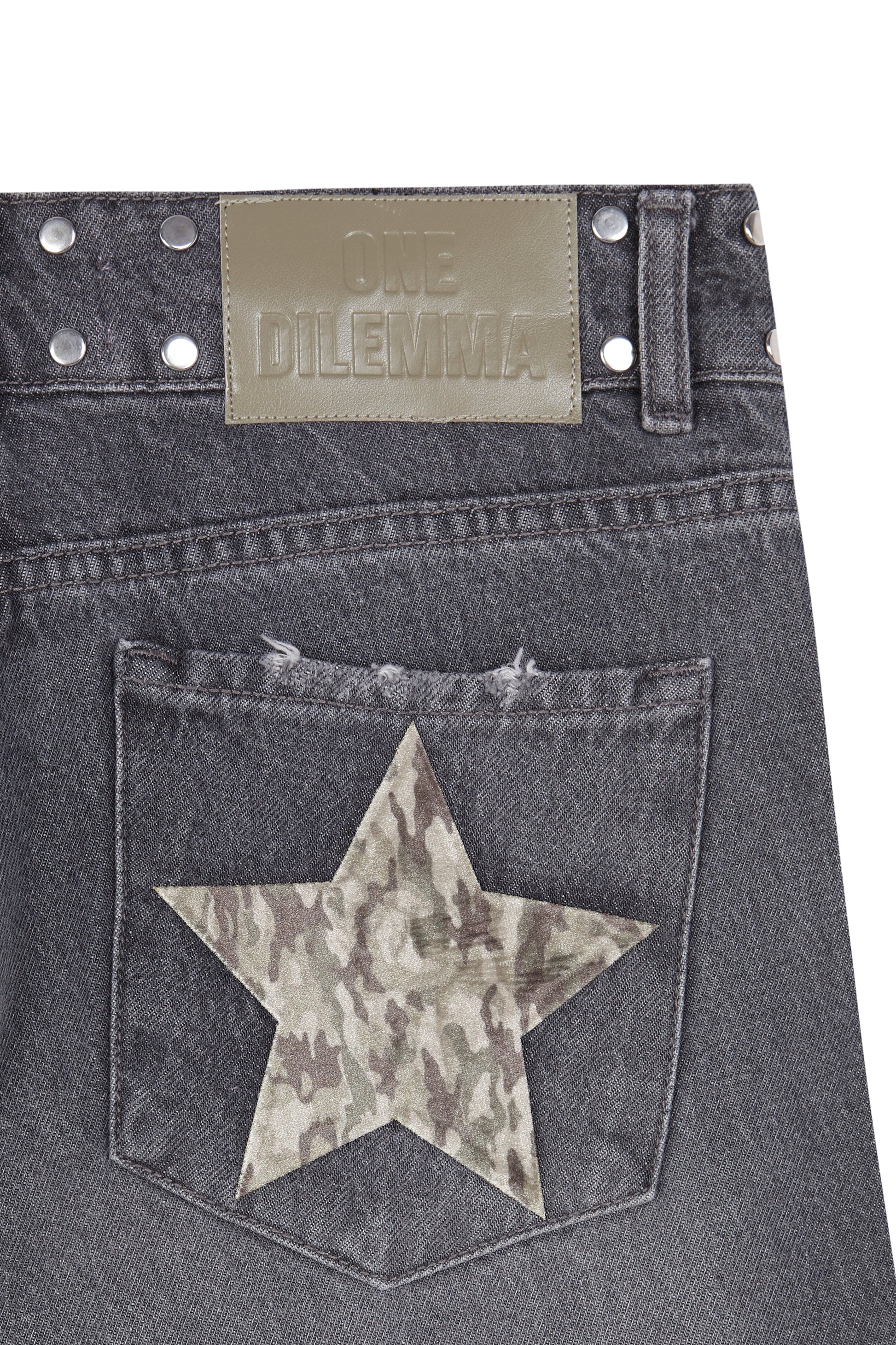 Jeans de tiro bajo con cuatro bolsillos y estrellas estampadas de camuflaje en tonos verdes, en los bolsillos vaqueros. Efecto lavado, con color gris vaquero. Pernera recta y larga. Cierre frontal con cremallera y botón metálico.