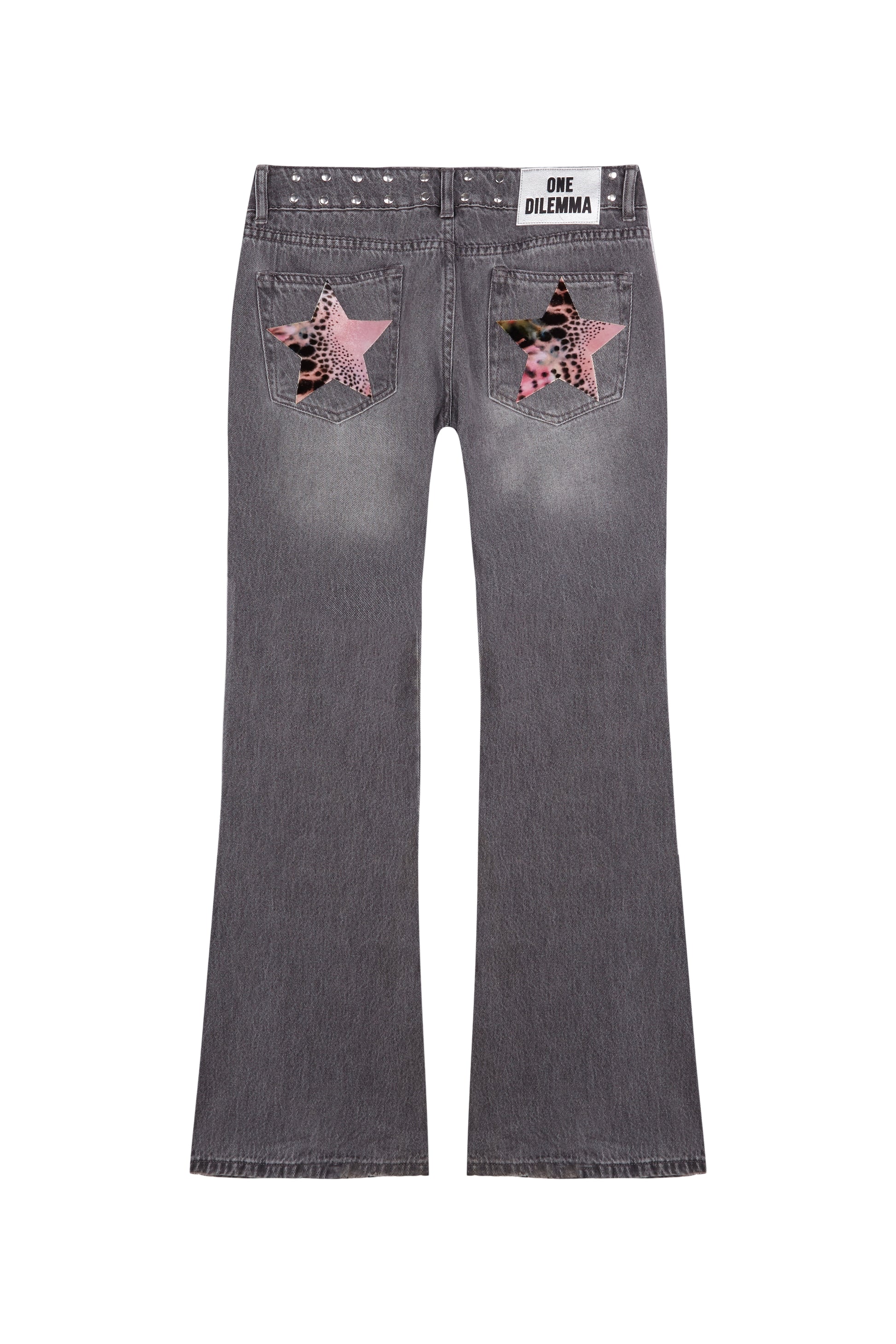 De tiro bajo con un botón central y cierre de cremallera. Contiene tachuelas a lo largo de toda la cadera de color plata. Las perneras se ensanchan hacia el bajo, creando una silueta vintage inspirada en los años 2000. Diseño de cuatro bolsillos con un diseño de estrellas estampadas rosas en los bolsillos traseros y etiqueta de cuero negra con detalles plateados.