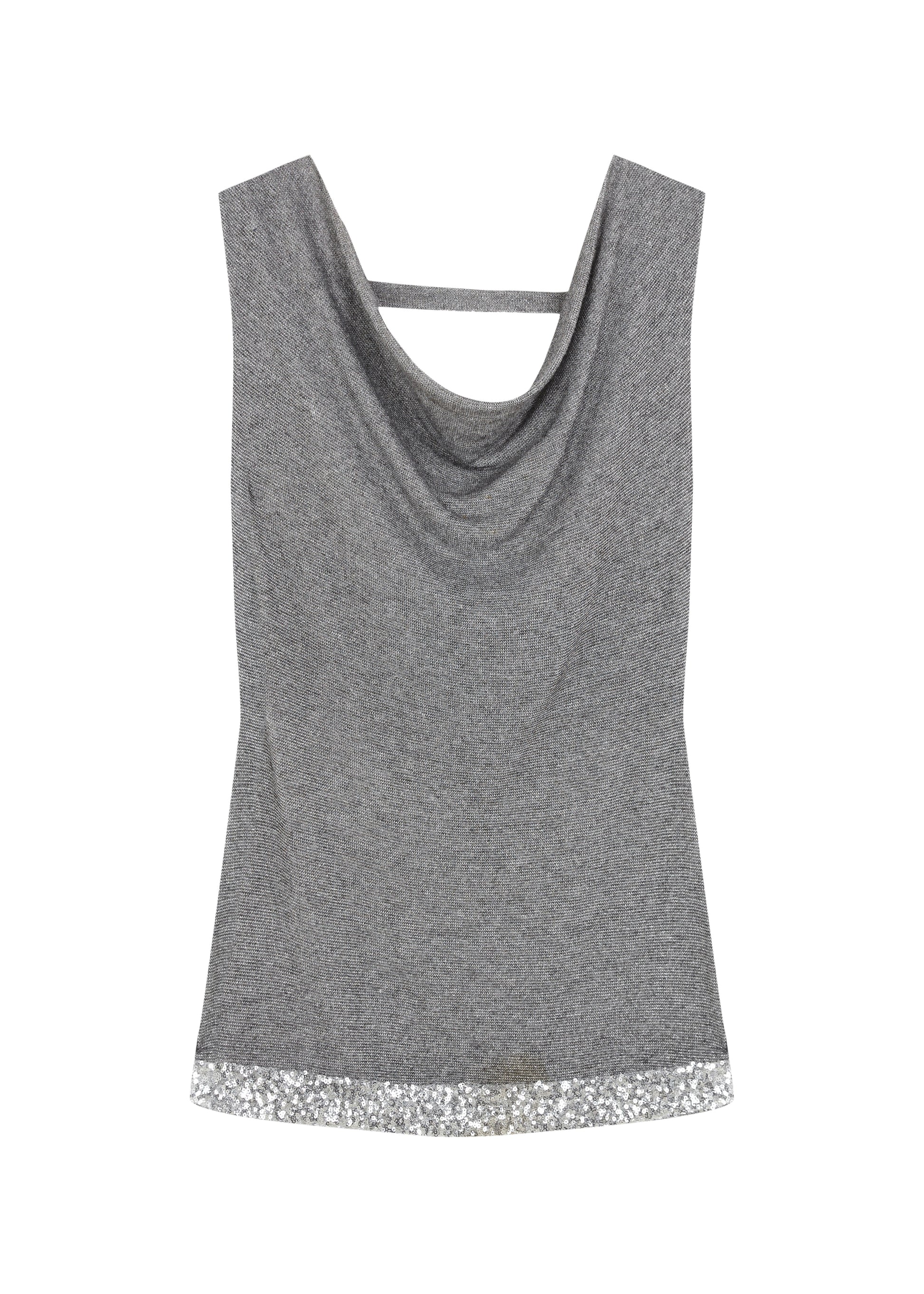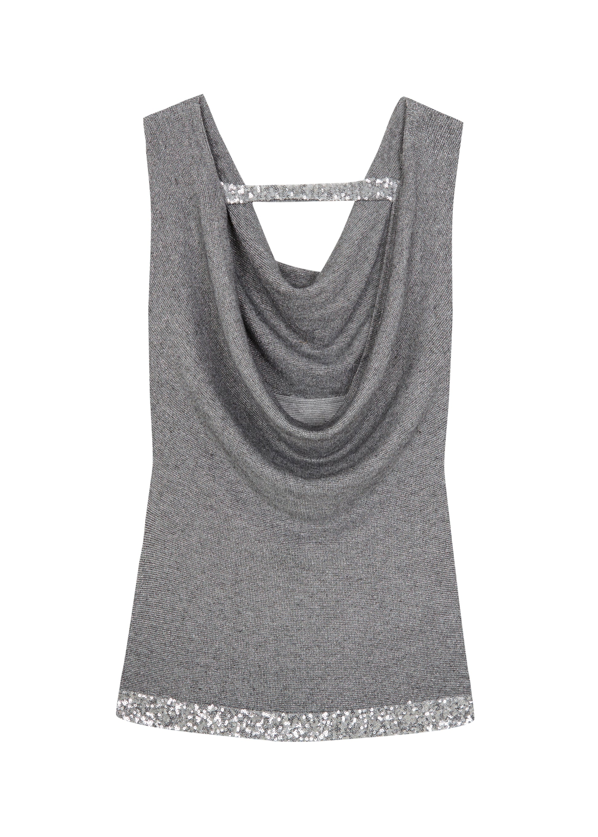 El Top Halo Grey combina elegancia y brillo en una prenda diseñada para destacar. Confeccionado en un tejido de punto gris con caída fluida, cuenta con un escote drapeado que realza la silueta y una espalda descubierta con tira decorativa. El detalle de lentejuelas plateadas en el bajo añade un toque luminoso y sofisticado que lo convierte en una pieza única.