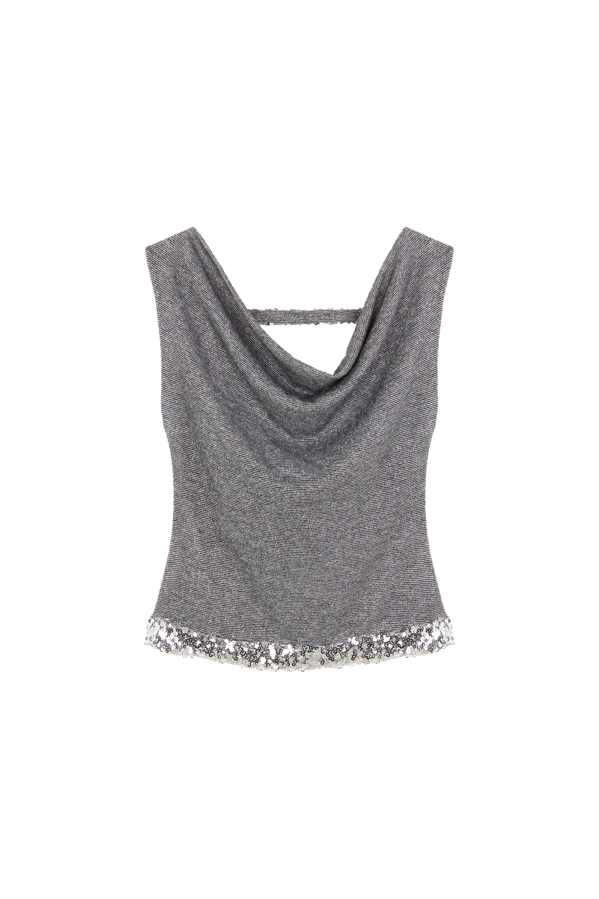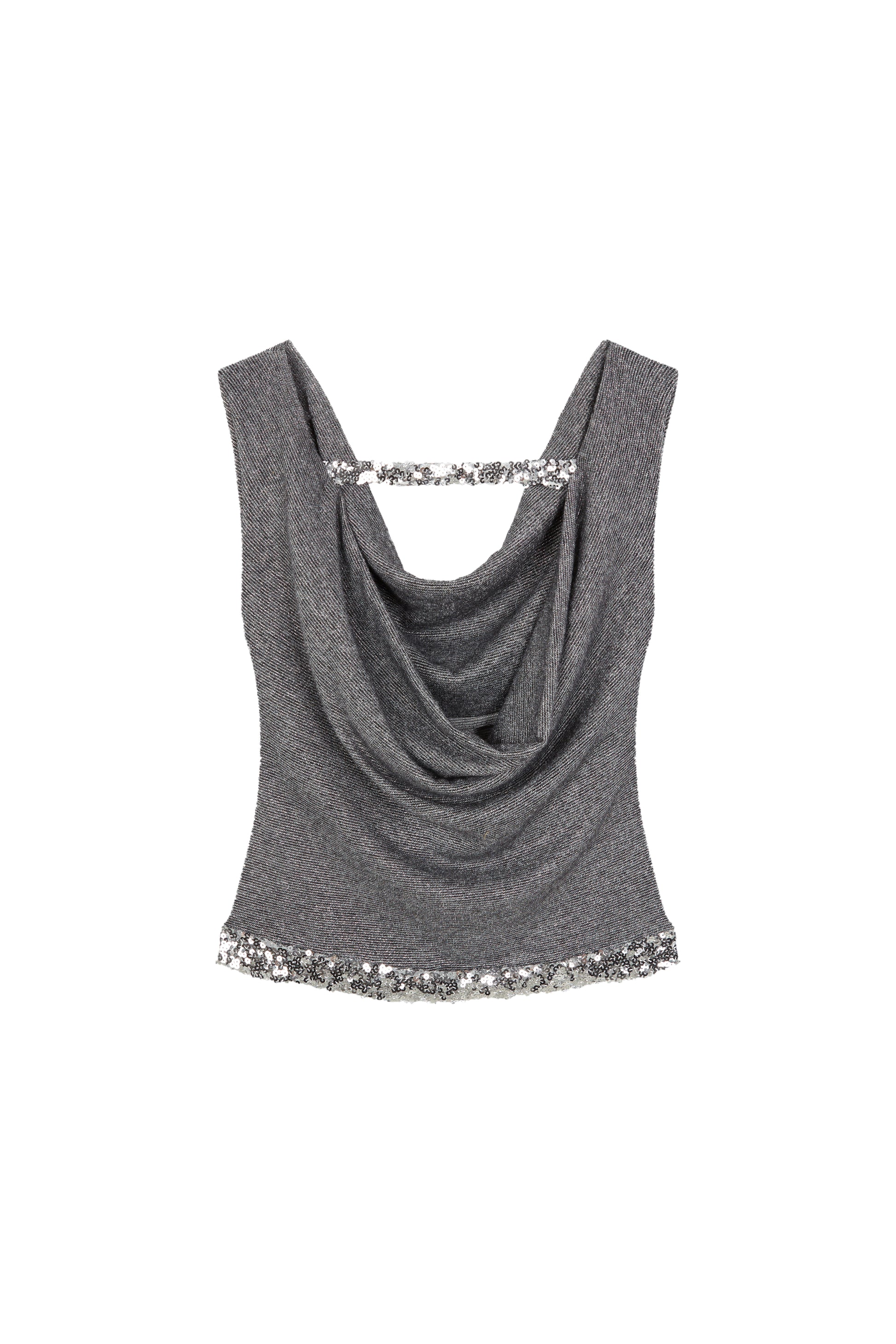 El Halo Top combina elegancia y brillo en una prenda diseñada para destacar. Confeccionado en un tejido de punto gris con caída fluida, cuenta con un escote drapeado que realza la silueta y una espalda descubierta con tira decorativa. El detalle de lentejuelas plateadas en el bajo añade un toque luminoso y sofisticado que lo convierte en una pieza única.